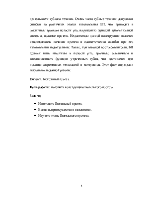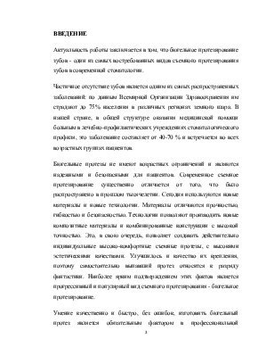 Актуальность работы заключается в том, что бюгельное протезирование зубов - один из самых востребованных видов съемного протезирования зубов в современной стоматологии.