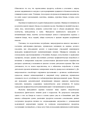 Учитывая, что недостаточное потребление микронутриентов является массовым и постоянно действующим фактором, отрицательно влияющим на здоровье детского населения, при обследовании детских и подростковых учреждений анализируется проведение профилактической поливитаминизации питания. Обращается внимание на использование зарегистрированных в Республике Беларусь отечественных и зарубежных препаратов, которые должны обеспечивать суточную профилактическую потребность в витаминах и минеральных веществах (соответствовать физиологическим потребностям растущего организма), и возможность приема в течение длительного времени. При этом учитывается, что не только недостаточное, но и избыточное потребление в течение длительного времени витаминов и минеральных веществ, прежде всего витаминов А, Д и микроэлементов способствует нарушению протекающих в организме метаболических процессов, снижает антиоксидантный и иммунный статус организма, отрицательно сказывается на его устойчивости к неблагоприятным факторам внешней среды. Поэтому для проведения дополнительной витаминизации пищевых рационов недопустимо применять препараты, содержащие терапевтические дозы витаминов. В период проведения профилактической поливитаминизации С-витаминизация не проводится.