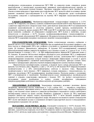 Идиопатическая тромбоцитопения, возможно, в большей части случаев обусловлена HCV инфекцией, чем считалось ранее. Hagamine с соавт. у 151 (41%) из 368 больных HCV инфекцией выявили тромбоцитопению и у 88% антитромбоцитарные антитела в высоком титре. Выраженная тромбоцитопения у части больных с HCV инфекцией, которая связывалась с гинерспленизмом, по-видимому, представляет НСУ-ассоциированную тромбоцитопению. Получены данные о репликации HCV в мегакариоцитах и тромбоцитах. Тромбоцитопения может инициироваться противовирусной терапией и отражать существующие нарушения у больных ХГС. что требует систематического исследования уровня тромбоцитов в период лечения интерфероном (обладающим иммуномодулирующим действием и способным запускать аутоиммунные реакции).