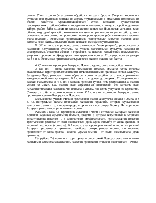 3. Бронзовый век (3-1 тыс. до н.э). Как изобрели литье металла? Раньше это появилось у кочевников. А чтобы было теплее, они в костер кидали камни. Первая руда – медь, позже стали делать добавки к меди, получили бронзу(олово+медь), которая уже заменяет камень. В этот период территорию Европы заселяют индоевропейские племена шнуровой керамики. На основе этих племен и места, в Беларуси формируются культуры: 1. северо-белорусская (оставлена финноуграми, отсутствуют следы производящего хозяйства);2. среднеднепровская (в основном скотоводческая, земледелие было вспомогательным, курганные захоронения); 3. вислонеманская (знали производящее хозяйство, но слабее, чем среднеднепровцы, грунтовые могилы). В это время на смену матриархата( семья формируется возле матери, отец неизвестен) приходит патриархат.