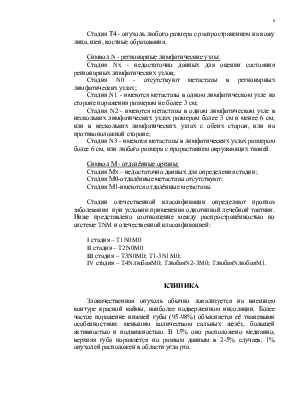 Злокачественные опухоли губ классифицируются по TNM-стадиям (международная классификация) и по отечественной классификации (обозначается римскими цифровыми символами).