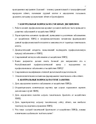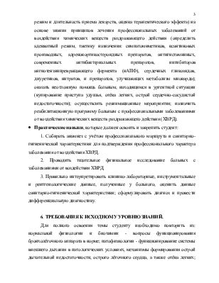 ·  Студент должен знать: причины развития, патогенез, клинические признаки профессиональных заболеваний от воздействия химических веществ раздражающего действия (ХВРД); алгоритм подтверждения профессионального характера данных видов патологии, принципы этиопатогенетической, дифференцированной терапии заболеваний от воздействия химических веществ раздражающего действия (исходя из этиопатогенетических особенностей разных видов патологии); тактику рационального трудоустройства и вопросы МРЭК.