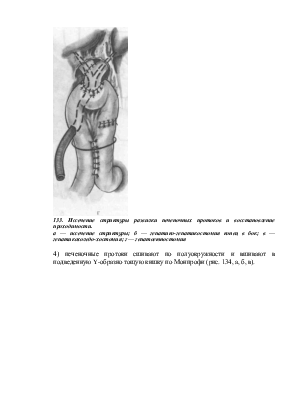 4) печеночные протоки сшивают по полуокружности и вшивают в подведенную Y-образно тощую кишку по Монпрофи (рис. 134, а, б, в).