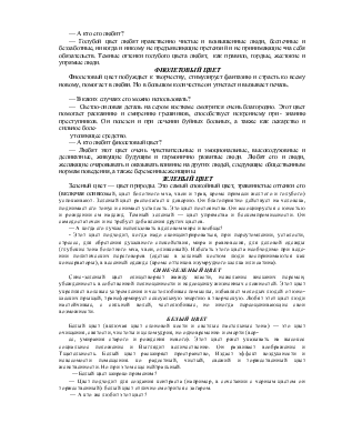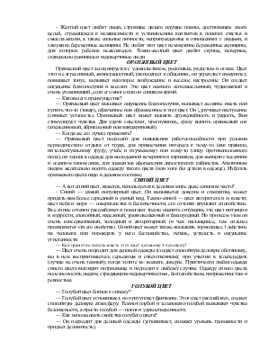 — Светло-лиловая деталь на сером костюме смотрится очень благородно. Этот цвет помогает раскаянию и смирению грешников, способствует искреннему при- знанию преступников. Он полезен и при лечении буйных больных, а также как лекарство и сильное болеутоляющее средство.