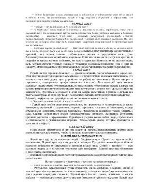 — Черный цвет олицетворяет элегантность, властность и силу, опрятность, простоту и хороший вкус. Он подчеркивает другие цвета, придает им более глубокое звучание, в больших количествах — угнетает. Этот цвет - сильный, загадочный, утонченный, строгий, торжественный, интеллектуальный и творческий. Черный цвет навевает фантазии. Но для многих он одновременно мрачный, надменный, скорбный, подавляющий и притягивающий все негативное.
