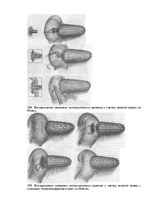Ряд хирургов (А А. Шалимов, Cattel и др.) пришли к заключению, что изолированное вшивание общего панкреатического протока дает меньше осложнений, в частности панкреатитов, панкоеатических свищей и холемических кровотечений, чем анастомоз с кишкой всей поверхности пересеченной железы. Поэтому был предложен ряд методик изолированного вшивания протока. Так, Cattel предложил оригинальную методику вшивания культи поджелудочной железы, при которой он перевязывает нерасширен