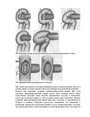 Первый этап операции — удаление поджелудочной железы. При этой операции может быть резецирована или головка железы, или полностью удалена вся железа. При резекции головки культю поджелудочной железы или зашивают наглухо ( Codevilla ), или вшивают в конец двенадцатиперстной (Kausch, 1912), в конец тощей кишки (Desjarden, 1907; Whipple, 1935), в бок тощей кишки (Cattel, 1945), в желудок (П. В. Кравченко, 1954) и т. д.