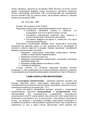При этом следует учитывать, что не всегда увеличение МОД означает улучшение газообменной функции легких. Одинаковые по величине МОД могут достигаться разными сочетаниями дыхательных объемов и частоты дыхания. В большинстве случаев частое и поверхностное дыхание менее эффективно по сравнению с редким и глубоким дыханием при одних и тех же значениях МОД. Это связано с существованием анатомического мертвого пространства, образованного бронхами, в котором, в отличие от альвеол, не происходит газообмена с кровью, протекающей через легкие. Доля МОД, приходящаяся на вентиляцию мертвого пространства, возрастает при частом и поверхностном дыхании. При таком дыхании эффективность газообмена в легких снижается, несмотря на увеличение МОД. Поэтому для более точной оценки газообменной функции легких используется показатель минутного объема альвеолярной вентиляции (АВ), рассчитываемый как произведение частоты дыхания (ЧД) на разность между дыхательным объемом и объемом мертвого пространства (МП):
