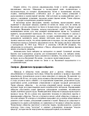 Опарин считал, что сначала сформировались белки и почти одновременно нуклеиновые кислоты. Мономеры в молекулярной цепи полипептидов и полунуклеотидов, из которых формировались белки и нуклеиновые кислоты, сходны, взаимодействовали, отличались друг от друга только размерами и расположением в молекулярной цепочке. Они вступали во взаимодействие друг с другом, с внешними условиями, порождая разные формы жизни. Таким образом, жизнь - продукт исторического развития материи.