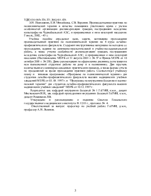 Учебное пособие определяет цели, задачи, мотивацию прохождения производственной практики по поликлинической терапии на 4 курсе лечебно-профилактического факультета. Содержит инструктивные материалы по методике ее прохождения, задания по санитарно-просветительной и учебно-исследовательской работе, а также учтены особенности диспансеризации граждан, пострадавших вследствие катастрофы на Чернобыльской АЭС, и приравненных к ним категорий населения (Постановление МЗ РБ от 31 августа 2001 г. № 57 и Приказ МЗ РБ от 18 октября 2001 г. № 250). Даны рекомендации по оформлению дневника, регистрации в нем выполненной студентом работы на дому и в поликлинике. Дан перечень количественного минимума освоенных практических навыков, а также формы отчета по проделанной за время прохождения практики работе. Соответствует учебному плану и типовым программам: «Программе по поликлинической терапии» для студентов лечебно-профилактического факультета высших медицинских учебных заведений МЗ РБ от 03. 09. 1997 г. и “Программе по внутренним болезням и военно-полевой терапии” для студентов лечебно-профилактического факультета высших медицинских учебных заведений” МЗ РБ от 10.12. 1997 г.