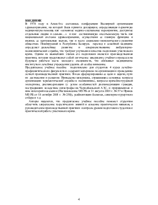 В 1978 году в Алма-Ате состоялась конференция Всемирной организации здравоохранения, на которой была принята декларация, определяющая первичную медицинскую помощь как «основные медико-социальные мероприятия, доступные отдельным людям и семьям…» и как составляющую «неотъемлемую часть как национальной системы здравоохранения, осуществляя ее главную функцию и являясь ее центральным звеном, так и всего социально-экономического развития общества». Планируемый в Республике Беларусь переход к семейной медицине определяет дальнейшее развитие и совершенствование амбулаторно-поликлинической службы, что требуют улучшения качества подготовки участкового врача. Одним из важнейших этапов его подготовки является производственная практика, которая представляет собой логическое завершение учебного процесса на будущем рабочем месте молодого специалиста, что обязывает медицинские институты и лечебные учреждения уделить ей особое внимание.