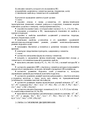 Сформировать системные знания об особенностях строения атомов p-элементов во взаимосвязи с их физическими и химическими свойствами; ознакомить с биогенной ролью р-элементов и применением в медицине лекарственных препаратов на основе их соединений, научить выполнять качественные реакции на катионы и анионы р-элементов в растворе.