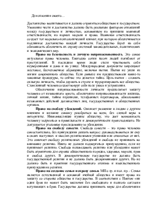 Право на свободу убеждений. Означает уважение к людям с другим мнением и желание самому разобраться во всем, без слепой веры в авторитеты. Инакомыслящие нужны обществу, это дает возможность человеку задуматься в правильности и демократичности происходящего. Не допускается уголовное преследование за убеждения.