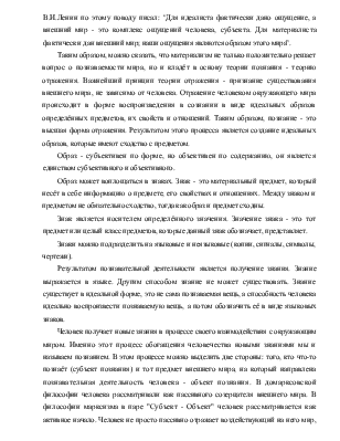 Таким образом, можно сказать, что материализм не только положительно решает вопрос о познаваемости мира, но и кладёт в основу теории познания - теорию отражения. Важнейший принцип теории отражения - признание существования внешнего мира, не зависимо от человека. Отражение человеком окружающего мира происходит в форме воспроизведения в сознании в виде идеальных образов определённых предметов, их свойств и отношений. Таким образом, познание - это высшая форма отражения. Результатом этого процесса является создание идеальных образов, которые имеют сходство с предметом.