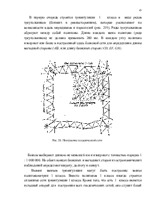 В комплекс работ по съемке местности входят следующие основные процессы: развитие на заданном участке местности съемочной геодезической сети; съемка ситуации и рельефа; вычислительная обработка результатов измерений, целью которой является получение координат и высот точек съемочной сети с оценкой точности их определения; графические работы, в процессе которых результаты измерений на местности и результаты вычислений переводятся на бумагу в виде планов, карт, профилей и других графических документов.