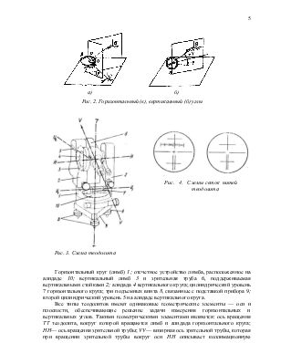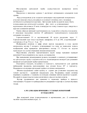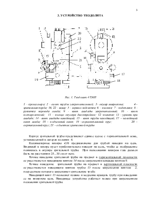 Зрительная труба 6 теодолита представляет собой оптическую систему, состоящую из объектива, фокусирующего устройства, окуляра и сетки нитей. Фокусирующее устройство, состоящее из одной или нескольких линз, может перемещаться внутри трубы относительно объектива и окуляра, тем самым обеспечивая резкость изображения при рассматривании визирных целей на различных расстояниях.