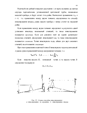 Геометрическое нивелирование основано на использовании горизонтальной линии визирования прибора, называемого нивелиром. Разность высот точек определяют из отсчетов по рей-кам, вертикально установленным в двух точках. Этот метод является наиболее совершенным и обеспечивает погрешность определения превышения от 0,5 до 50 мм на 1 км хода.