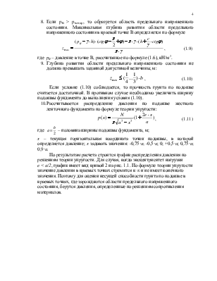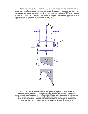 Если условие (1.8) выполняется, области предельного напряженного состояния не образуются, ширину подошвы фундамента принять как в п. 4, и переходить к выполнению п. 10. В случае, если по условию (1.8) получается излишний запас, необходимо уменьшить ширину подошвы фундамента в пределах этого условия с округлением в 0,1 м.