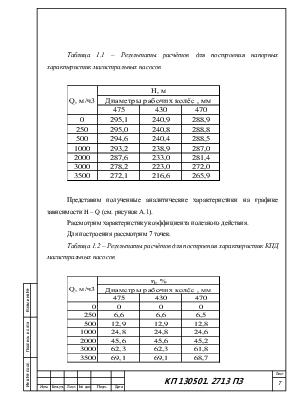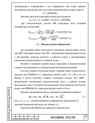 Согласно заданию на курсовой проект, перекачка нефти осуществляется насосами типа НМ7000-210 с диаметрами рабочих колёс: 475, 430 и 470 мм. Подпор в начале перекачки создаётся подпорным насосом типа НПВ - центробежный вертикальный одноступенчатый насос с рабочим колесом двустороннего входа. В данной технологической схеме перекачки используется  насосы типа НПВ3600-90 с диаметром рабочего колеса 550 мм.