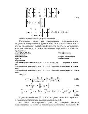 Структурная схема для параллельного программирования получается из передаточной функции (3.6), если ее представить в виде суммы элементарных дробей. Коэффициенты С0, С1, С2, вычисленные методом Хевисайда, и корни знаменателя определяют с помощью программы: