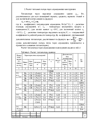 Расчет теплопотерь через ограждающие конструкции сводим в табл.1