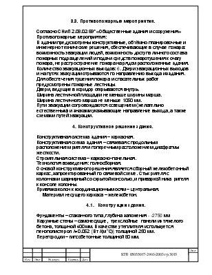 В здании предусмотрены конструктивные, объёмно-планировочные и инженерно-технические решения, обеспечивающие в случае пожара: возможность эвакуации людей, возможность доступа личного состава пожарных подразделений и подачи средств пожаротушения к очагу пожара, не распространение пожара на рядом расположенные здания. Количество эвакуационных выходов: 6. Двери эвакуационных выходов и на путях эвакуации отрываются по направлению выхода из здания. Для обеспечения тушения пожара и спасательных работ предусмотрены пожарные лестницы.