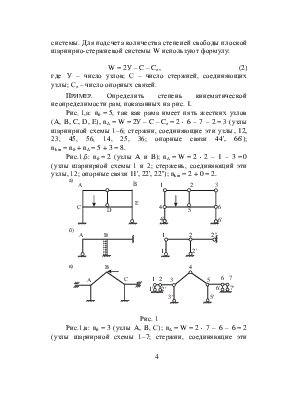 Рис. 1,а: nq = 5, так как рама имеет пять жестких узлов (A, B, C, D, E), nD = W = 2У – C – Cо = 2 × 6 – 7 – 2 = 3 (узлы шарнирной схемы 1–6; стержни, соединяющие эти узлы, 12, 23, 45, 56, 14, 25, 36; опорные связи 44', 66'); nkin = nq + nD = 5 + 3 = 8.