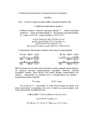 Х=R sinφ; У=R(1-cosφ), где φ=(λρ˚)/R; (λ – расстояние от точки начала кивой до пикета если пикет расположен до вершины угла или от пикета до конца кривой, если пикет расположен за вершиной угла).