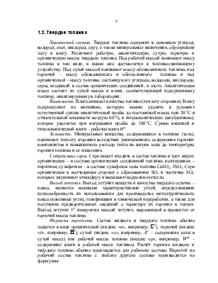 Химический состав. Твердое топливо содержит в основном углерод, водород, азот, кислород, серу, а также минеральные включения, образующие золу и влагу. Различают рабочую, аналитическую, сухую, горючую и органическую массы твердого топлива. Под рабочей массой понимают массу топлива в том виде, в каком оно доставляется к топливосжигающему устройству. Под сухой массой понимают массу обезвоженного топлива, под горючей – массу обезвоженного и обеззоленного  топлива и под органической – массу топлива, состоящую из углерода, водорода, кислорода, серы, входящей в состав органических соединений, и азота. Аналитическая масса состоит из сухой массы и влаги, соответствующей подсушенному топливу, анализируемому в лаборатории.