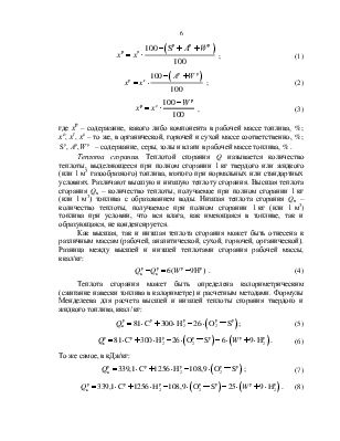 Топливо различных видов и месторождений различается по составу. Под составом твердого и жидкого топлива понимают содержание в нем следующих компонентов: углерода С, водорода Н, серы S, кислорода О, азота N, золы А и влаги W. Применительно к газообразному топливу под составом понимают содержание газообразных составляющих, в основном: окиси углерода СО, водорода Н2, метана СН4, этана С2Н6, пропана С3Н8, бутана С4Н10, этилена С2Н4, бензола С6Н6 и др. Входящие в состав топлива кислород О и азот N относят к внутреннему балласту; зола и влага являются внешним балластом. Состав жидкого и твердого топлива выражают в процентах по массе, газообразного – в процентах по объему.