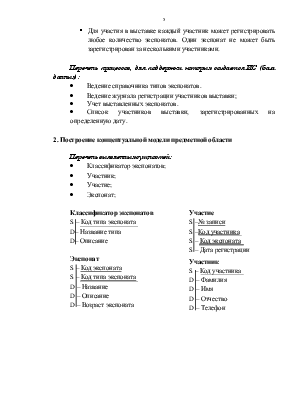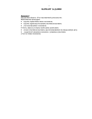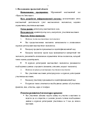 Цель разработки информационной системы: автоматизация учета выставочной деятельности (учет выставленных экспонатов), ведения справочника участников выставки.