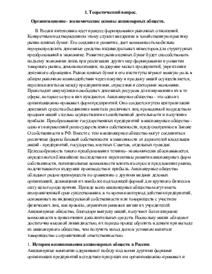В России интенсивно идет процесс формирования рыночных отношений. Конкретным подтверждением этому служит внедрение в хозяйственную практику рынка ценных бумаг. Его создание и развитие, дает возможность мобильно перераспределять денежные средства индивидуальных инвесторов для структурных преобразований в экономике. Развитие рынка ценных бумаг будет способствовать подъему экономики лишь при реализации других мер формирования и развития товарного рынка, демонополизации, поддержке малых предприятий, укреплении денежного обращения. Рынок ценных бумаг и его институты играют важную роль в общем рыночном взаимодействии через покупку и продажу акций осуществляется, перелив капиталов между предприятиями, отраслями и секторами экономики. Происходит аккумуляция свободных денежных ресурсов для направления их в те сферы, которые остро в них нуждаются. Акционерное общество - это одна из организационно-правовых форм предприятий. Оно создается путем централизации денежных средств объединения капитала различных лиц, проводимой посредством продажи акций с целью осуществления хозяйственной деятельности и получения прибыли. Преобразование государственных предприятий в акционерные общества - одно из направлений разгосударствления собственности, предусмотренное в Законе О собственности в РФ. Вместе с тем в акционерное общество могут соединиться различные формы базовой собственности в зависимости от держателей владельцев акций - предприятий, государства, местных Советов, отдельных граждан. Целесообразность такого преобразования технико- экономически обосновывается, определяются ближайшие последствия и перспективы развития акционерных форм собственности, потенциальные возможности влиять на спрос и предложение рынка, подсчитываются издержки производства и прибыль. Акционерные общества обладают рядом преимуществ по сравнению с другими видами деловых организаций, делающими их наиболее подходящей формой для крупного бизнеса в силу целого ряда причин. Прежде всего акционерные общества могут иметь неограниченный срок существования, в то время как период действия предприятий, основанных на индивидуальной собственности или товариществ с участием физических лиц, как правило, ограничен рамками жизни их учредителей. Акционерные общества, благодаря выпуску акций, получают более широкие возможности в привлечении дополнительных средств. Поскольку акции обладают достаточно высокой ликвидностью, их гораздо проще обратить в деньги при выходе из акционерного общества, чем получить назад долю в уставном капитале товарищества с ограниченной ответственностью.