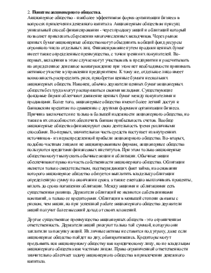 2. Понятие акционерного общества.                                                                          Акционерное общество - наиболее эффективная форма организации бизнеса в вопросах привлечения денежного капитала. Акционерным обществам присущ уникальный способ финансирования - через продажу акций и облигаций который позволяет привлекать сбережения многочисленных вкладчиков. Через рынок ценных бумаг акционерные общества могут объединять в общий фонд ресурсы огромного числа отдельных лиц. Финансирование путем продажи ценных бумаг имеет также определенные преимущества, с точки зрения их покупателей. Во-первых, вкладчики в этом случае могут участвовать в предприятии и рассчитывать на определенное денежное вознаграждение при этом нет необходимости принимать активное участие в управлении предприятием. К тому же, отдельное лицо имеет возможность распределять риск, приобретая ценные бумаги нескольких акционерных обществ. Наконец, обычно держатели ценных бумаг акционерных обществ без труда могут распоряжаться своими вкладами. Существующие фондовые биржи облегчают движение ценных бумаг между покупателями и продавцами. Более того, акционерные общества имеют более легкий доступ к банковским кредитам по сравнению с другими формами организации бизнеса. Причина заключается не только в большей надежности акционерного общества, но также в их способностях обеспечить банкам прибыльность счетов. Вообще акционерные общества финансируют свою деятельность тремя различными способами. Во-первых, значительная часть средств поступает из внутренних источников - из нераспределенной прибыли акционерного общества. Во-вторых, подобно частным лицам и не акционированным фирмам, акционерные общества пользуются кредитами финансовых институтов. При этом только акционерные общества могут выпускать обычные акции и облигации. Обычные акции обеспечивают право на часть собственности акционерного общества. Облигации является только свидетельством, подтверждающих факт займа, на основании которого акционерное общество обязуется выплатить владельцу облигации определенную сумму по окончании срока, а также ежегодно выплачивать проценты, вплоть до срока погашения облигации. Между акциями и облигациями есть существенная разница. Держатели облигаций не являются собственниками компаний, а только ее кредиторами. Облигации в меньшей степени связаны с риском, чем акции, но при успешной работе акционерного общества держатели акций получат более высокий доход от своих вложений.