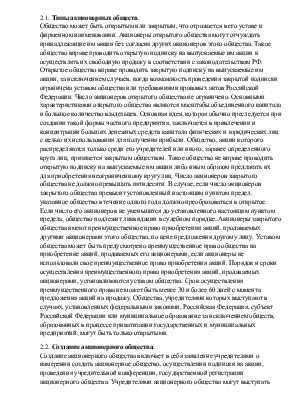 2.1. Типы акционерных обществ.                                                                                  Общество может быть открытым или закрытым, что отражается в его уставе и фирменном наименовании. Акционеры открытого общества могут отчуждать принадлежащие им акции без согласия других акционеров этого общества. Такое общество вправе проводить открытую подписку на выпускаемые им акции и осуществлять их свободную продажу в соответствии с законодательством РФ. Открытое общество вправе проводить закрытую подписку на выпускаемые им акции, за исключением случаев, когда возможность проведения закрытой подписки ограничена уставом общества или требованиями правовых актов Российской Федерации. Число акционеров открытого общества не ограничено. Основными характеристиками открытого общества являются масштабы объединенного капитала и большое количество владельцев. Основная идея, которая обычно преследуется при создании такой формы частного предприятия, заключается в привлечении и концентрации больших денежных средств капитала физических и юридических лиц с целью их использования для получения прибыли. Общество, акции которого распределяются только среди его учредителей или иного, заранее определенного круга лиц, признается закрытым обществом. Такое общество не вправе проводить открытую подписку на выпускаемые им акции либо иным образом предлагать их для приобретения неограниченному кругу лиц. Число акционеров закрытого общества не должно превышать пятидесяти. В случае, если число акционеров закрытого общества превысит установленный настоящим пунктом предел, указанное общество в течение одного года должно преобразоваться в открытое. Если число его акционеров не уменьшится до установленного настоящим пунктом предела, общество подлежит ликвидации в судебном порядке. Акционеры закрытого общества имеют преимущественное право приобретения акций, продаваемых другими акционерами этого общества, по цене предложения другому лицу. Уставом общества может быть предусмотрено преимущественное право общества на приобретение акций, продаваемых его акционерами, если акционеры не использовали свое преимущественное право приобретения акций. Порядок и сроки осуществления преимущественного права приобретения акций, продаваемых акционерами, устанавливаются уставом общества. Срок осуществления преимущественного права не может быть менее 30 и более 60 дней с момента предложения акций на продажу. Общества, учредителями которых выступают в случаях, установленных федеральными законами, Российская Федерация, субъект Российской Федерации или муниципальное образование за исключением обществ, образованных в процессе приватизации государственных и муниципальных предприятий, могут быть только открытыми.