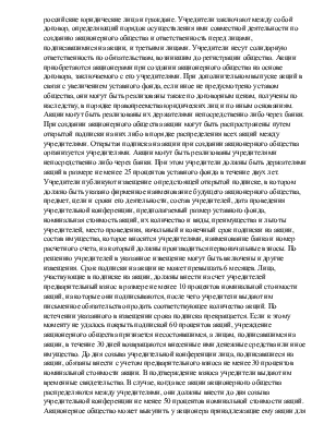 2.2. Создание акционерного общества.                                                                          Создание акционерного общества включает в себя заявление учредителями о намерении создать акционерное общество, осуществлении подписки на акции, проведения учредительной конференции, государственной регистрации акционерного общества. Учредителями акционерного общества могут выступать российские юридические лица и граждане. Учредители заключают между собой договор, определяющий порядок осуществления ими совместной деятельности по созданию акционерного общества и ответственность перед лицами, подписавшимися на акции, и третьими лицами. Учредители несут солидарную ответственность по обязательствам, возникшим до регистрации общества. Акции приобретаются акционерами при создании акционерного общества на основе договора, заключаемого с его учредителями. При дополнительном выпуске акций в связи с увеличением уставного фонда, если иное не предусмотрено уставом общества, они могут быть реализованы также по договорным ценам, получены по наследству, в порядке правопреемства юридических лиц и по иным основаниям. Акции могут быть реализованы их держателями непосредственно либо через банки. При создании акционерного общества акции могут быть распространены путем открытой подписки на них либо в порядке распределения всех акций между учредителями. Открытая подписка на акции при создании акционерного общества организуется учредителями. Акции могут быть реализованы учредителями непосредственно либо через банки. При этом учредители должны быть держателями акций в размере не менее 25 процентов уставного фонда в течение двух лет. Учредители публикуют извещение о предстоящей открытой подписке, в котором должно быть указано фирменное наименование будущего акционерного общества, предмет, цели и сроки его деятельности, состав учредителей, дата проведения учредительной конференции, предполагаемый размер уставного фонда, номинальная стоимость акций, их количество и виды, преимущества и льготы учредителей, место проведения, начальный и конечный срок подписки на акции, состав имущества, которое вносится учредителями, наименование банка и номер расчетного счета, на который должны производиться первоначальные взносы. По решению учредителей в указанное извещение могут быть включены и другие извещения. Срок подписки на акции не может превышать 6 месяцев. Лица, участвующие в подписке на акции, должны внести на счет учредителей предварительный взнос в размере не менее 10 процентов номинальной стоимости акций, на которые они подписываются, после чего учредители выдают им письменное обязательство продать соответствующее количество акций. По истечении указанного в извещении срока подписка прекращается. Если к этому моменту не удалось покрыть подпиской 60 процентов акций, учреждение акционерного общества признается несостоявшимся, а лицам, подписавшимся на акции, в течение 30 дней возвращаются внесенные ими денежные средства или иное имущество. До дня созыва учредительной конференции лица, подписавшиеся на акции, обязаны внести с учетом предварительного взноса не менее 30 процентов номинальной стоимости акции. В подтверждение взноса учредители выдают им временные свидетельства. В случае, когда все акции ак
