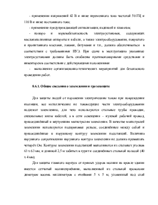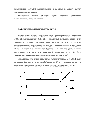 Заземляющее устройство выполняется стальным уголком 63 х 63 х 4 мм на расстоянии 8 м друг от друга заглублёнными на 0,7 м от поверхности земли и связанными между собой стальной полосой с площадью сечения 40 х 4 мм2.