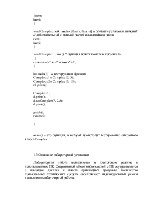 Опишем класс комплексных чисел. Объявим в нем поля для действительной и мнимой части. Объявим два конструктора, создающих объекты класса Complex – нулевого числа и с ненулевыми частями числа. Опишем методы установки значений действительной и мнимой части числа и печати комплексного числа.