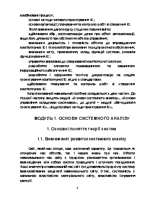 Запропонований навчальний посібник складається з двох частин. До першої частину входять модулі «Основи системного аналізу», «Основи управління складними системами», до другої – модулі «Методологія проектування ІС», «Індустріальні методи проектування ІС».