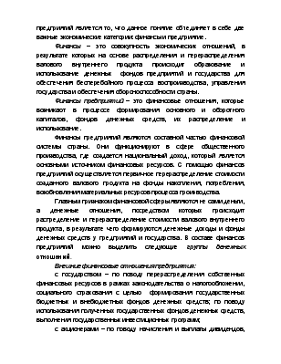 Главным признаком финансовой сферы являются не сами деньги, а денежные отношения, посредством которых происходит распределение и перераспределение стоимости валового внутреннего продукта, в результате чего формируются денежные доходы и фонды денежных средств у предприятий и государства. В составе финансов предприятий можно выделить следующиегруппы денежных отношений.