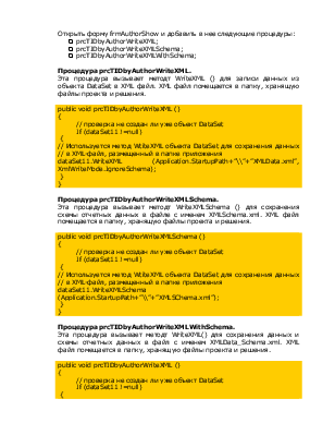 public void prcTIDbyAuthorWriteXMLSchema () { // проверка не создан ли уже объект DataSet If (dataSet11 !=null) { // Используется метод WtiteXML объекта DataSet для сохранения данных // в XML-файл, размещенный в папке приложения dataSet11.WriteXMLSchema (Application.StartupPath+”\\”+”XMLSChema.xml”); } } |