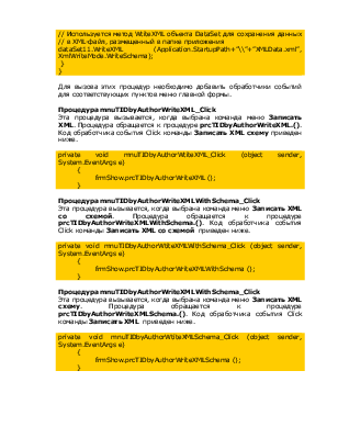 Эта процедура вызывается, когда выбрана команда меню Записать XMLсо схемой. Процедура обращается к процедуре prcTIDbyAuthorWriteXMLWithSchema.(). Код обработчика события Click команды Записать XMLсо схемой приведен ниже.