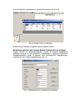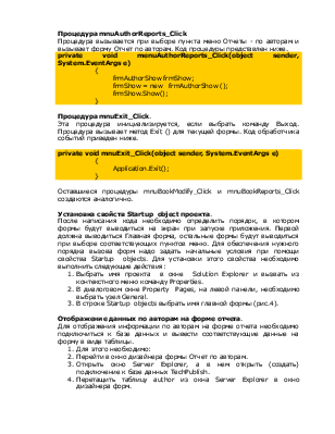 Процедура вызывается при выборе пункта меню Отчеты - по авторам и вызывает форму Отчет по авторам. Код процедуры представлен ниже.