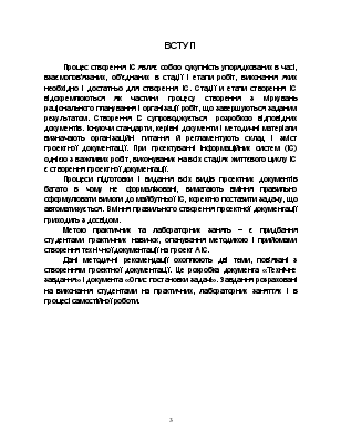 Дані методичні рекомендації охоплюють дві теми, пов’язані з створенням проектної документації. Це розробка документа «Технічне завдання» і документа «Опис постановки задачі». Завдання розраховані на виконання студентами на практичних, лабораторних заняттях і в процесі самостійної роботи.
