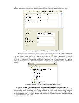 Для установки первичного ключа используется команда меню Diagram-Set Primary Key или специальную кнопку на панели инструментов . Для сохранения созданной таблицы, необходимо закрыть окно редактора таблицы и окне сохранения ввести имя таблицы. Аналогично создаются остальные таблицы для проектируемой ИС. После создания всех таблиц их можно просмотреть в окне Server Explorer, открыв узел Tables (рис. 5).