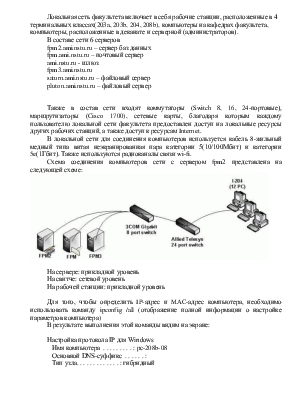 Также в состав сети входят коммутаторы (Switch 8, 16, 24-портовые), маршрутизаторы (Cisco 1700), сетевые карты, благодаря которым каждому пользователю локальной сети факультета предоставлен доступ на локальные ресурсы других рабочих станций, а также доступ к ресурсам Internet.
