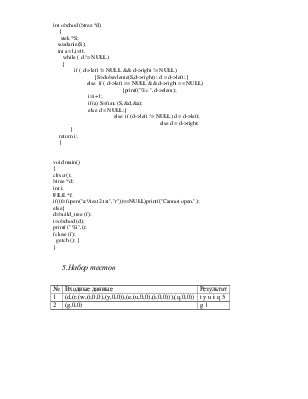 5.Прямой обход дерева (создаёт стек, пока текущий указатель не NULL: если указатели на левое и правое поддерево не нулевые помещаем указатель на правое поддерево в стек и движемся по левой ветви, иначе если указатели на левое и правое поддерево нулевые (зн., перед нами лист) увеличивает число листьев, печатает значение текущего указателя, если стек не пуст берём элемент из стека, иначе тек. указатель получает значение NULL, иначе если указатель на левое поддерево не нулевой, то тек. указатель получает значение указателя на левое поддерево, иначе – правое поддерево )