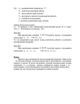 Метод пошаговой регрессии состоит в том,  что на каждом шаге производиться либо включение в модель, либо исключение из модели какого-то одного регрессора. На каждом шаге один из регрессоров,  скажем , исключается, если при  его удалении RSS увеличивается на величину, не большую, чем умножение на  значение средней остаточной суммы квадратов . Другими словами регрессор  исключается на данном шаге,  если F- отношение для проверки гипотезы   в используемой в этот момент модели регрессии не превышает значения . Если такому условию удовлетворяет несколько регрессоров, то выбирается тот из них для которого увеличение RSS оказывается наименьшим (это равносильно наименьшему F - отношению). Если указанному условию не удовлетворяет ни один регрессор, то в модель включают регрессор, скажем  , введение которого уменьшает RSS на величину, не меньшую, чем умножение на     значение средней остаточной суммы квадратов, подсчитанной после включения  в модель. Иначе говоря, регрессор  включается на данном шаге в модель,  если F- отношение для проверки гипотезы   в модели, полученной добавлением этого регрессора к модели. Рассматриваемой на данном шаге, оказывается не меньшим, чем .И опять , если такому условию удовлетворяет несколько регрессоров, то в модель включается тот из них, который обеспечивает наибольшее уменьшение RSS( или что равносильно наибольшему  F – отношению). Процедура начинается с того, что подбираем  , а затем пытаемся ввести какой-нибудь регрессор.