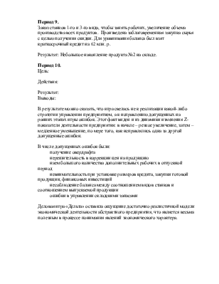 В этом периоде были осознанны ошибки складирования продуктов 1 и 2 типа – мы прекратили их производить, увеличив производство продукта №3. Но цены остались на прежнем уровне, а для продукта №2 были даже немного повышены, так что проблему это не решило. Прекращена дозакупка продуктов 1 и 2 типа. Произведена заблаговременная закупка сырья с целью получения скидки. Ухудшилось качество продукта №2. Для уравнивания баланса был взят долгосрочный кредит на 44 млн. р.