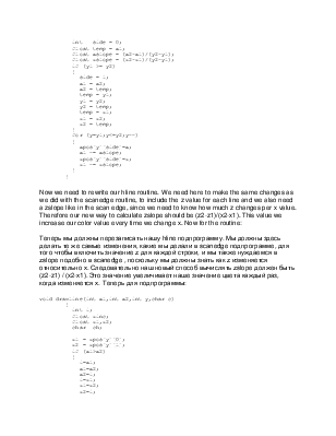 Для начала мы нуждаемся в новой переменной, называемой zpos. Zpos имеет тот же самый тип как xpos, но это отражает позицию z в позиции x, которую мы берем из xpos массива. Давайте сделаем пример. Если мы имеем полигон из вышеупомянутого изображения, мы видим, что точка, где наш xpos дает нам xpos налево/справа многоугольника, мы имеет z цвет также. Но что такая помощь дала бы нам? Да, правильно, мы изменяем нашу hline подпрограмму, чтобы рисовать различные цвета от xpos [y] [0] до xpos [y] [1]. Это не должно быть настолько трудно вообще, хотя мы должны перезаписать наши подпрограммы, но очень немного, я могу гарантировать Вам.
