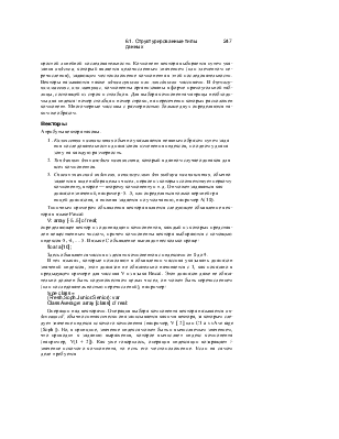 простой линейной последовательности. Компонент вектора выбирается путем указания индекса, который является целочисленным значением (или элементом перечисления), задающим местоположение компонента в этой последовательности. Векторы называются также одномерными или линейными массивами. В двухмерном массиве, или матрице, компоненты организованы в форме прямоугольной таблицы, состоящей из строк и столбцов. Для выбора компонента матрицы необходимы два индекса: номер столбца и номер строки, на пересечении которых расположен компонент. Многомерные массивы с размерностью больше двух определяются таким же образом.